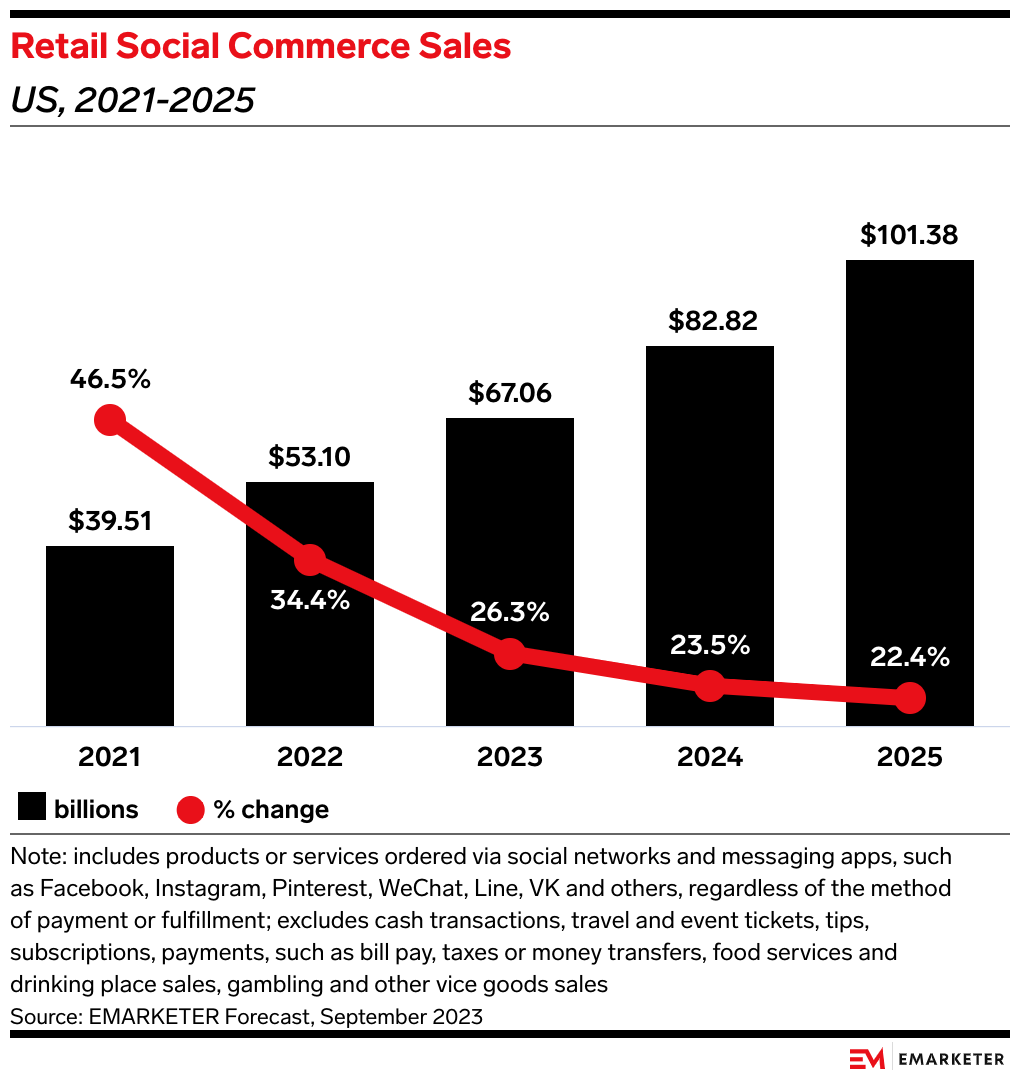Despite slowing, US social commerce sales will grow 23.5% this year, reaching $82.82 billion, per our forecast.