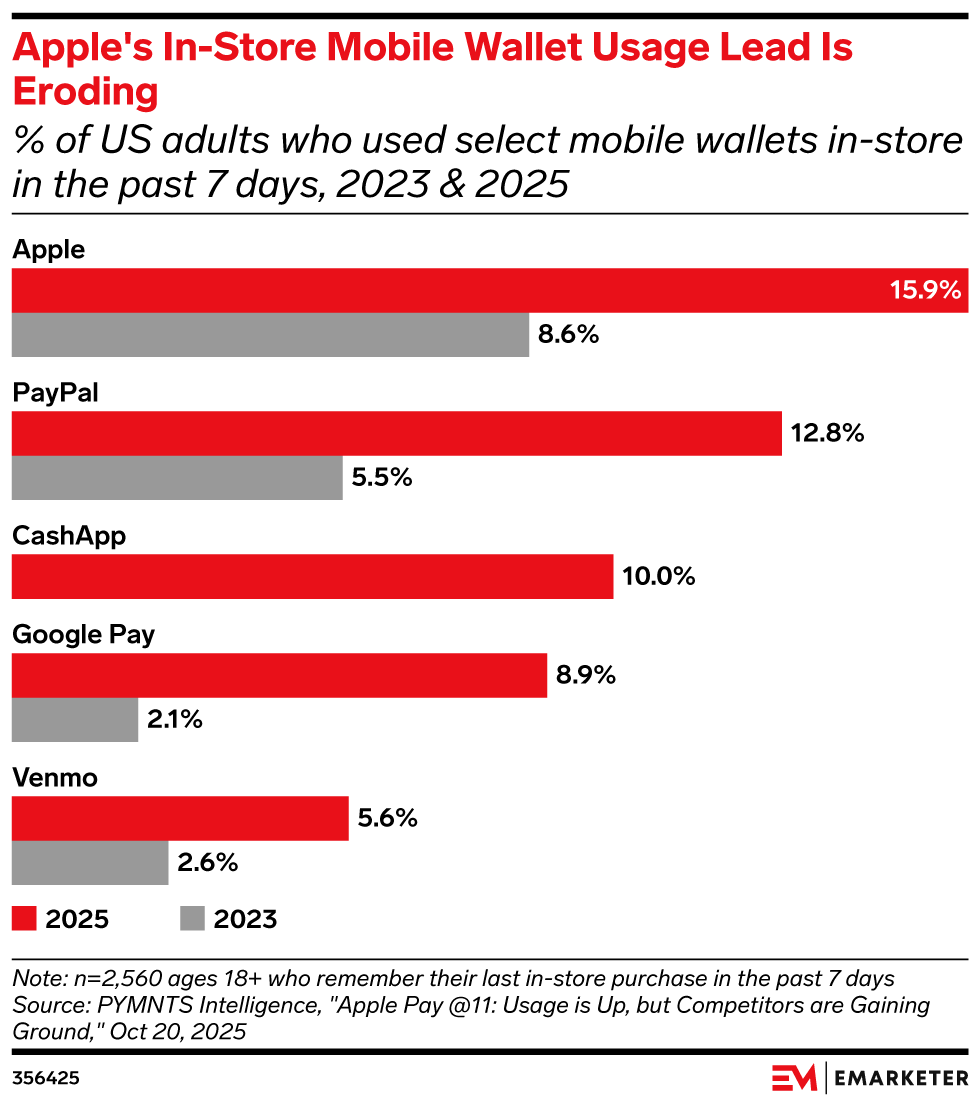 Apple Pay remains dominant at the POS but PayPal, Cash App, and Google Pay gain ground