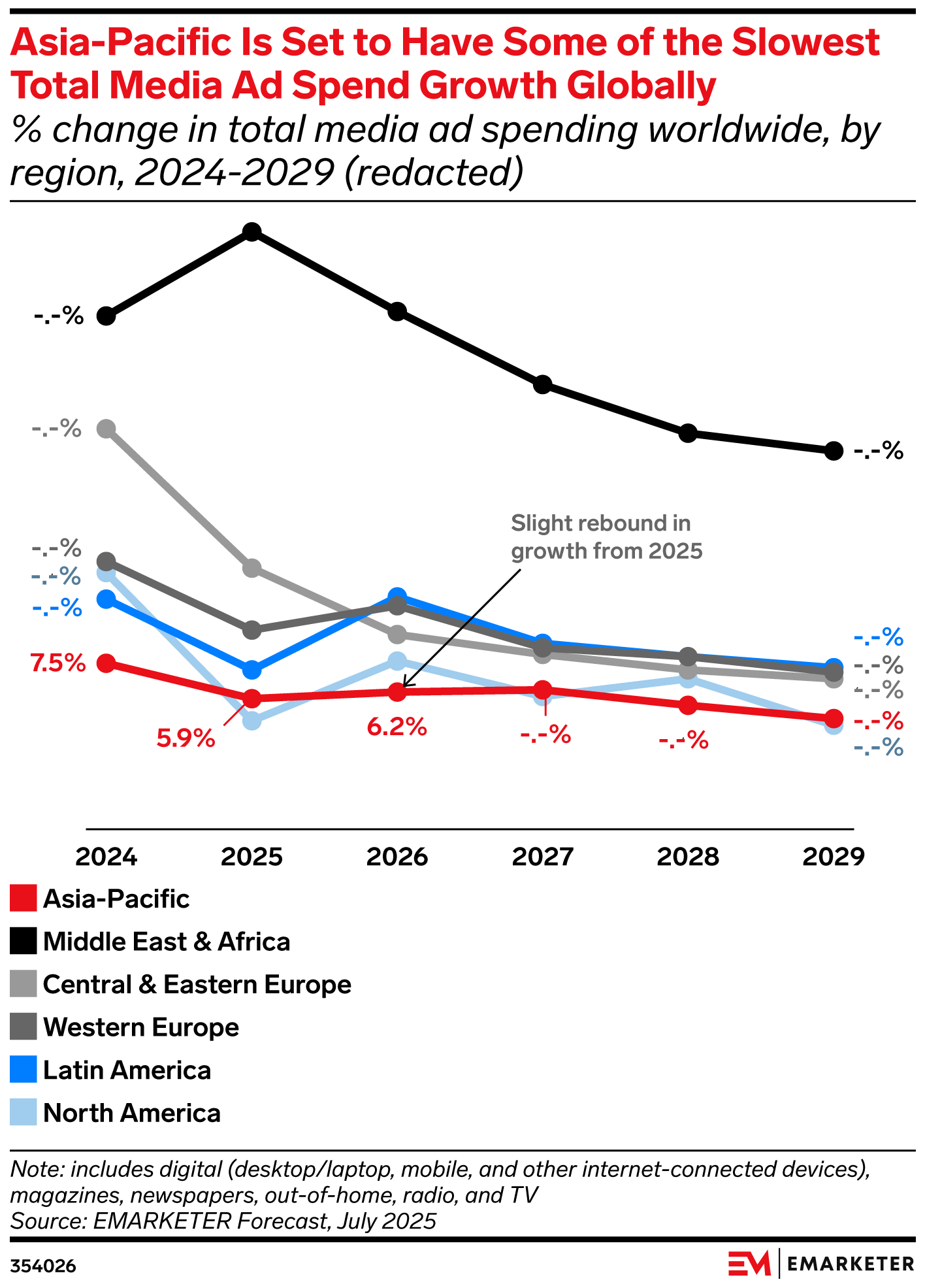 Key Stat: Total media ad spending growth in Asia-Pacific will decline from 7.5% in 2024 to 5.9% in 2025, followed by a rebound to 6.2% in 2026.