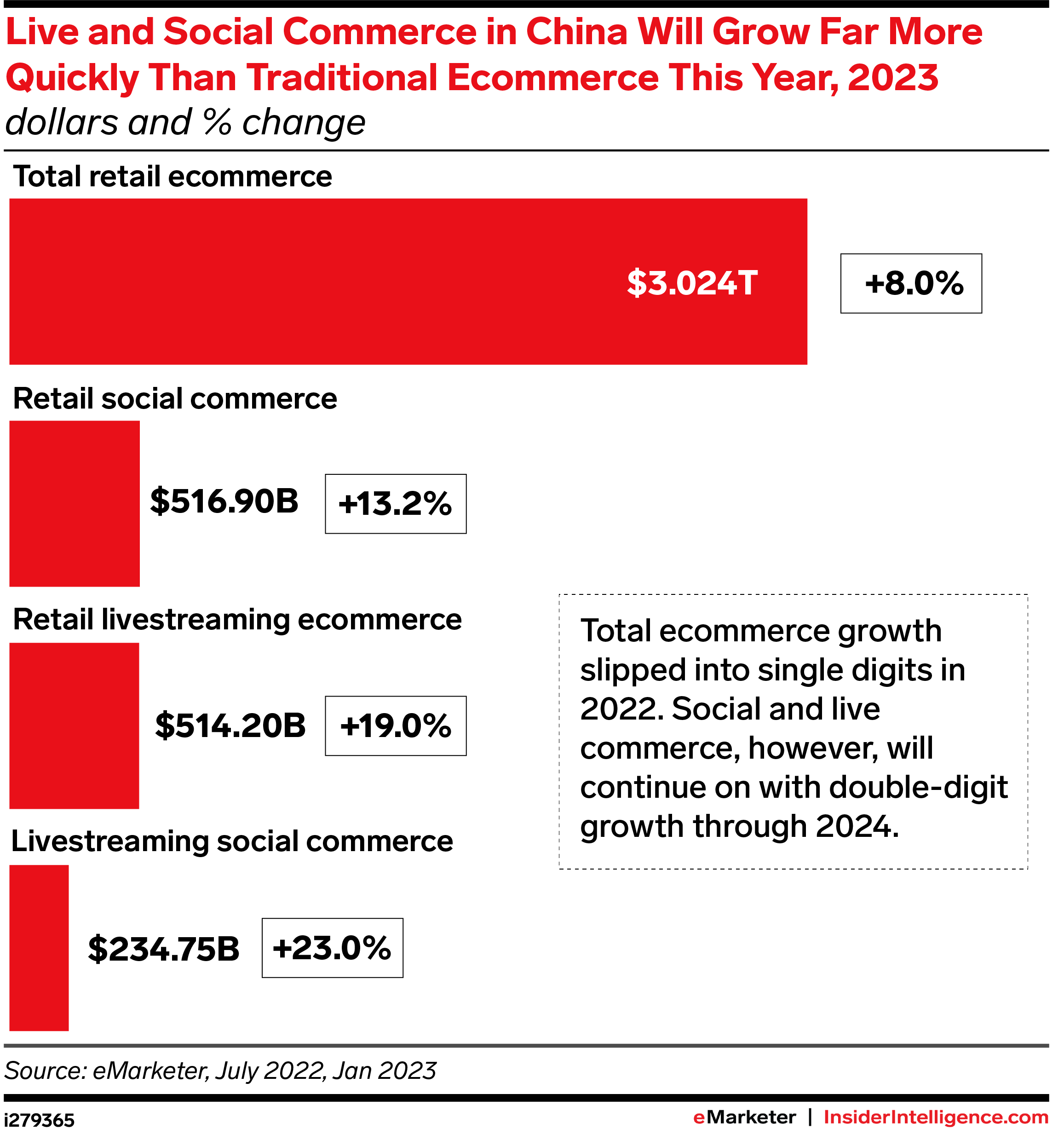 • Social commerce. Though slowing, social will still outpace total ecommerce, growing 13.2% year over year (YoY). And livestreaming via social media will grow fastest of all, by 23.0%.