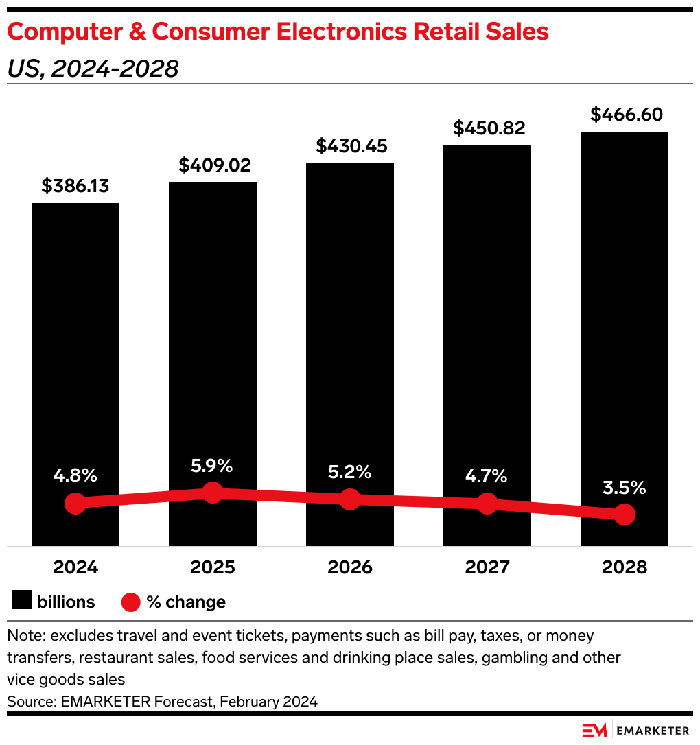 • However, we expect computer and electronics sales to accelerate throughout the second half of the year. Our forecast expects sales in the category to grow 4.8% YoY, a significant gain after sales fell 2.0% YoY in 2022 and rose just 1.4% YoY last year.