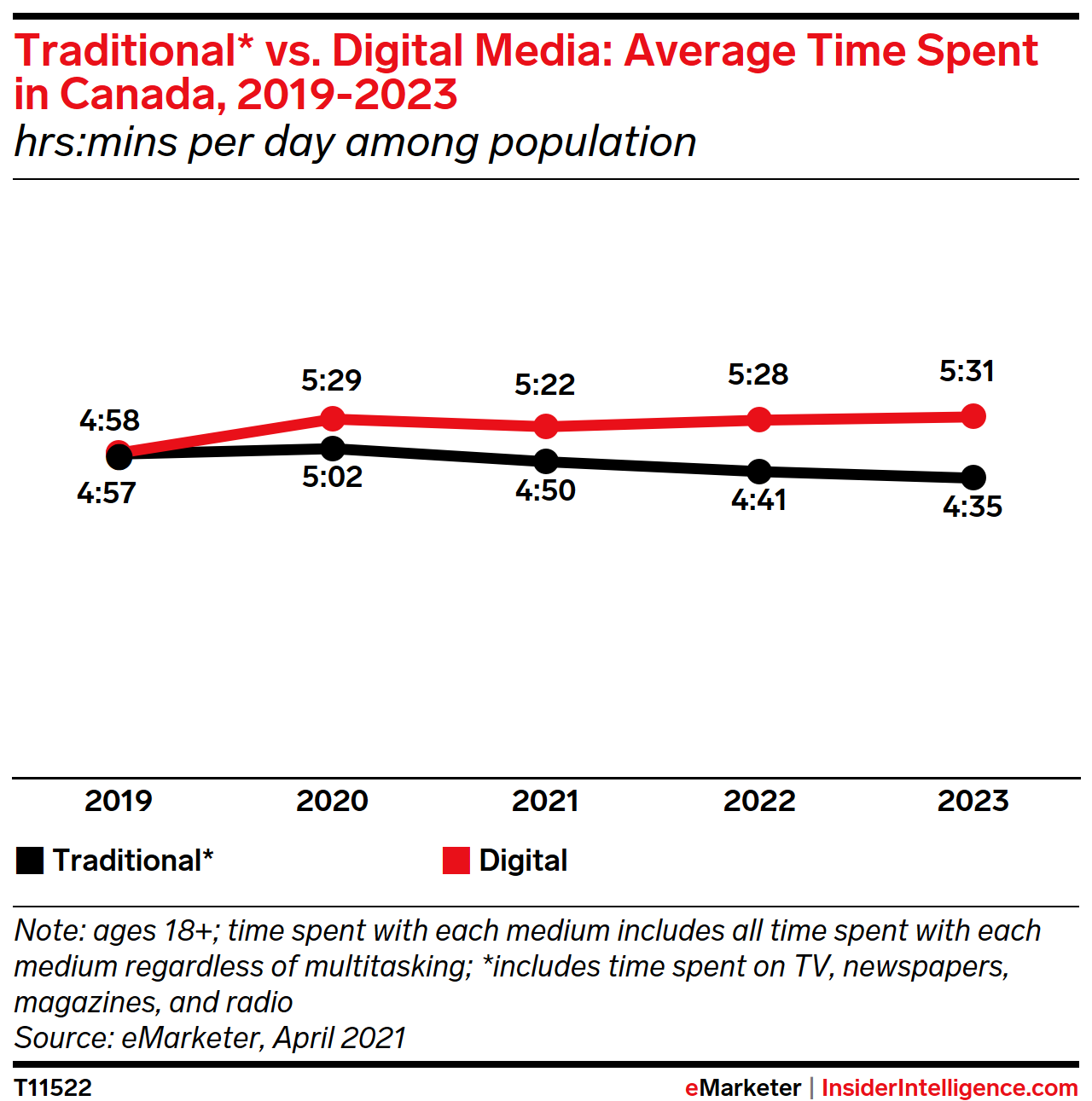 KEY STAT: Digital media will account for 52.6% of all media time in 2021, with adults in Canada spending an average of 5:22 with the medium daily.