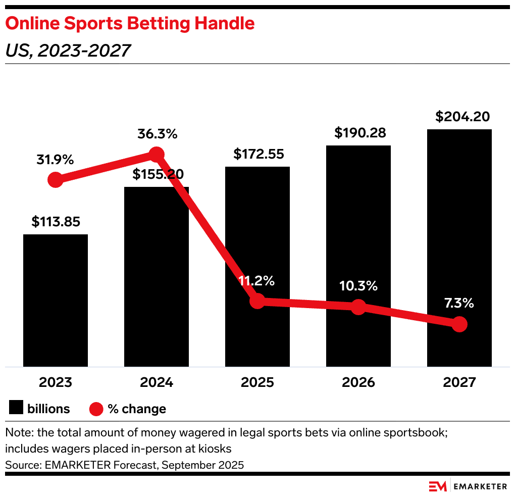 The federal legalization of sports betting in 2018 kicked off a steady boom for online sportsbooks. The days of triple-digit growth rates are over, but new state laws are still driving notable growth. Here are key figures from EMARKETER’s forecast on US sports betting, a market set to reach nearly $211 billion in wagers in 2027.