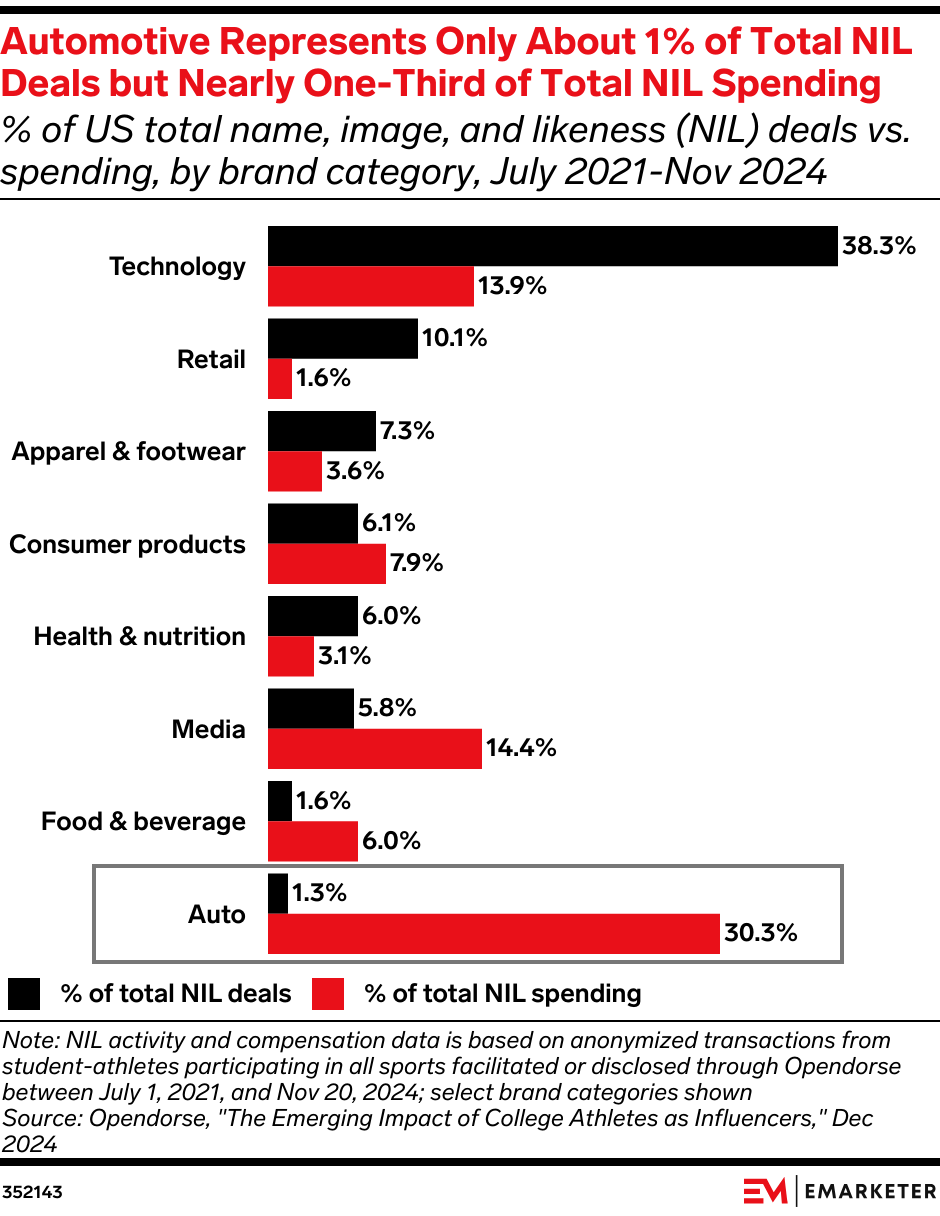 Key Stat: Nearly half of NIL activities between 2021 and 2024 were driven by technology and retail brands, according to Opendorse.