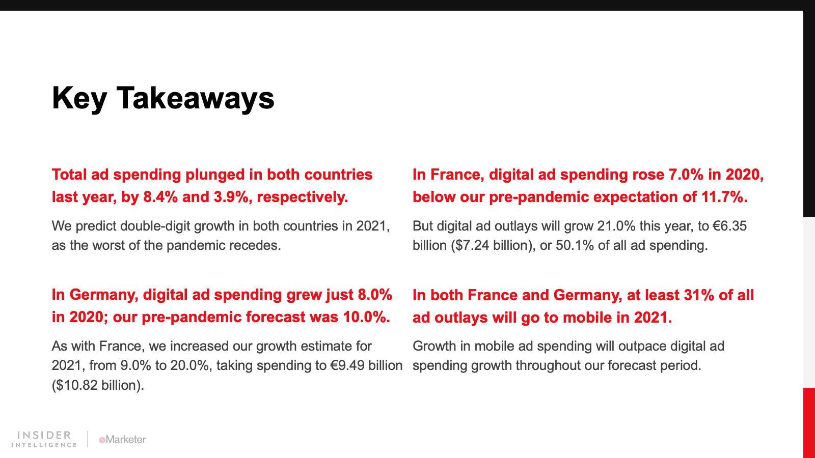 Total ad spending in France and Germany took a big hit in 2020, as a result of the pandemic. But digital advertising bucked that trend and will lead a strong double-digit recovery in ad outlays during 2021.