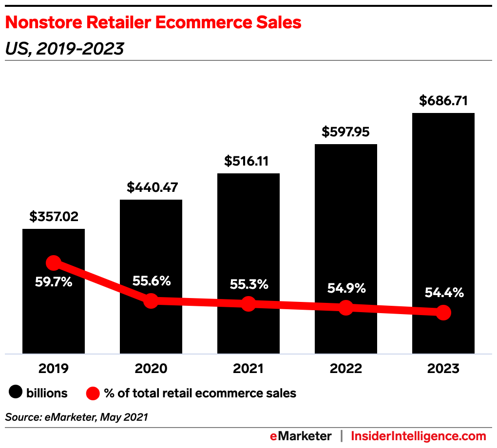 Looking ahead: Forecasters expect multichannel sales to make up close to 46% of all ecommerce sales by 2023, up from 40.3% in 2019. That said, nonstore retailers will still dominate over 54% of the market, with sales approaching $687 billion.