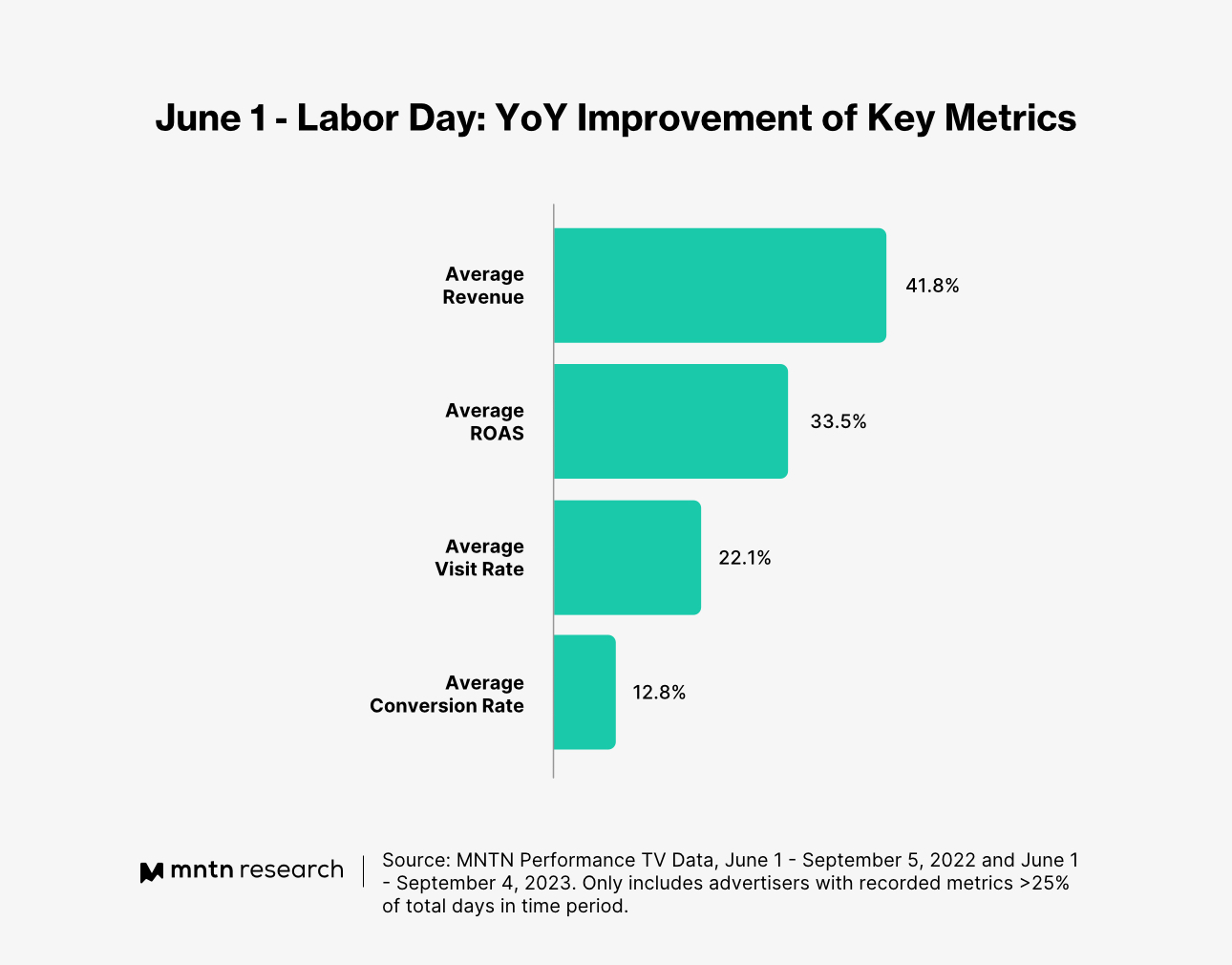 We found that industries with a tie-in to the season—think apparel, home and garden, and recreation—saw notable year-over-year growth. When comparing these advertisers’ performance between June 1, 2023, and Labor Day 2023 to the same period in 2022, we found that average revenue increased by 41.8% and average return on ad spend by 33.5%, in addition to other key metrics.