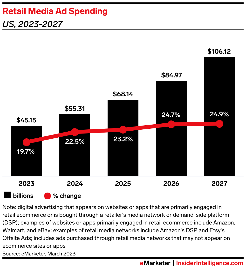 US retail media ad spend will hit $45.15 billion this year, an increase of almost 20% over 2022, according to our forecast. Growth will accelerate each year through 2027, when we expect spend to reach $106.12 billion.
