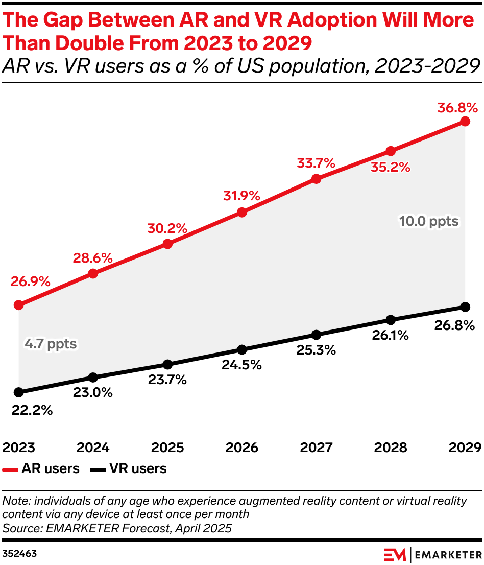 Key Stat: AR adoption will pass 30% of the US population in 2025. Meanwhile, VR will be used by just 26.8% of the population by the end of our forecast period in 2029.