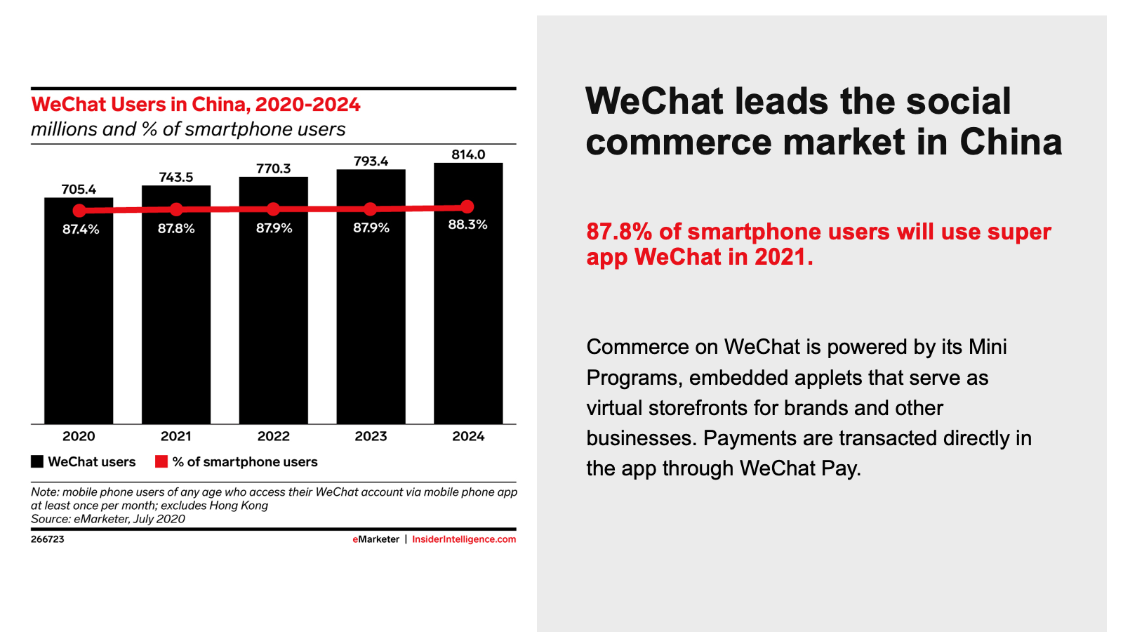 Facebook is the top social commerce platform in the US, with 56.1 million buyers in 2021, according to our inaugural forecast. Instagram is in second place, with 32.4 million, followed by Pinterest, with 13.9 million. WeChat dominates the social commerce space in China, though group-buying apps like Pinduoduo have also driven its growth.