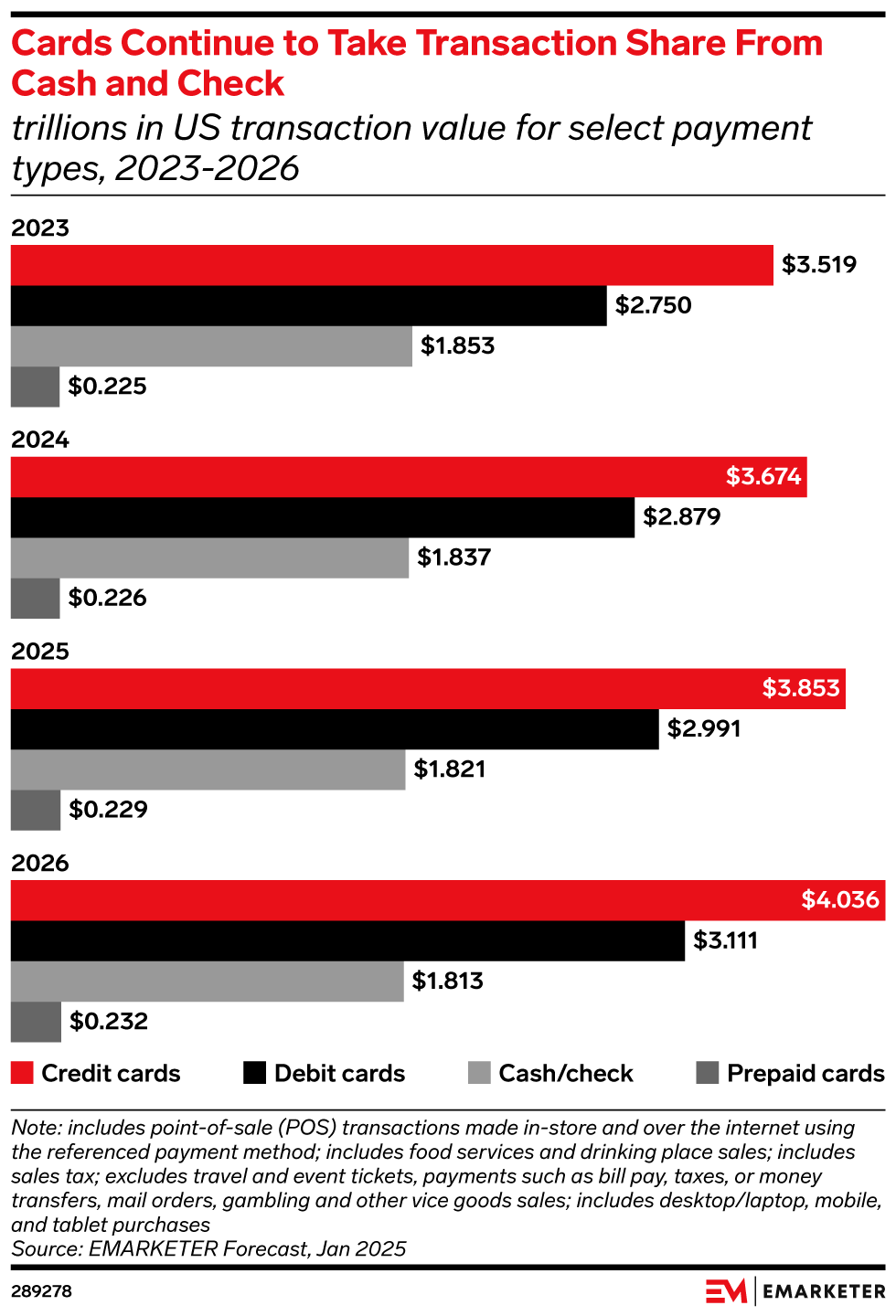 Key Stat: Total payment card transaction value will grow 4.3% in 2025, per our forecast, as debit and credit cards continue to steal share from cash and checks.