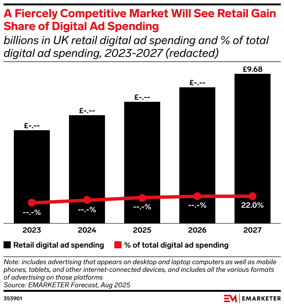 Key Stat: Retail is the biggest industry in terms of total digital ad spend and will approach £10 billion ($12.78 billion) by 2027. Competition in the retail sector is so fierce that it will actually make slight gains in revenue share.