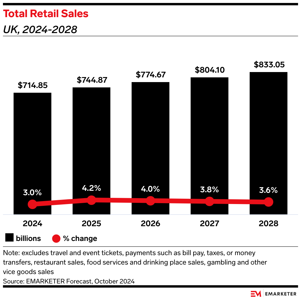 Our take: UK retailers are in a tough spot. While a retailer like Next may be able to weather the UK’s challenges thanks to its strong ecommerce sales and growing international business, other merchants may not have those same levers to pull.