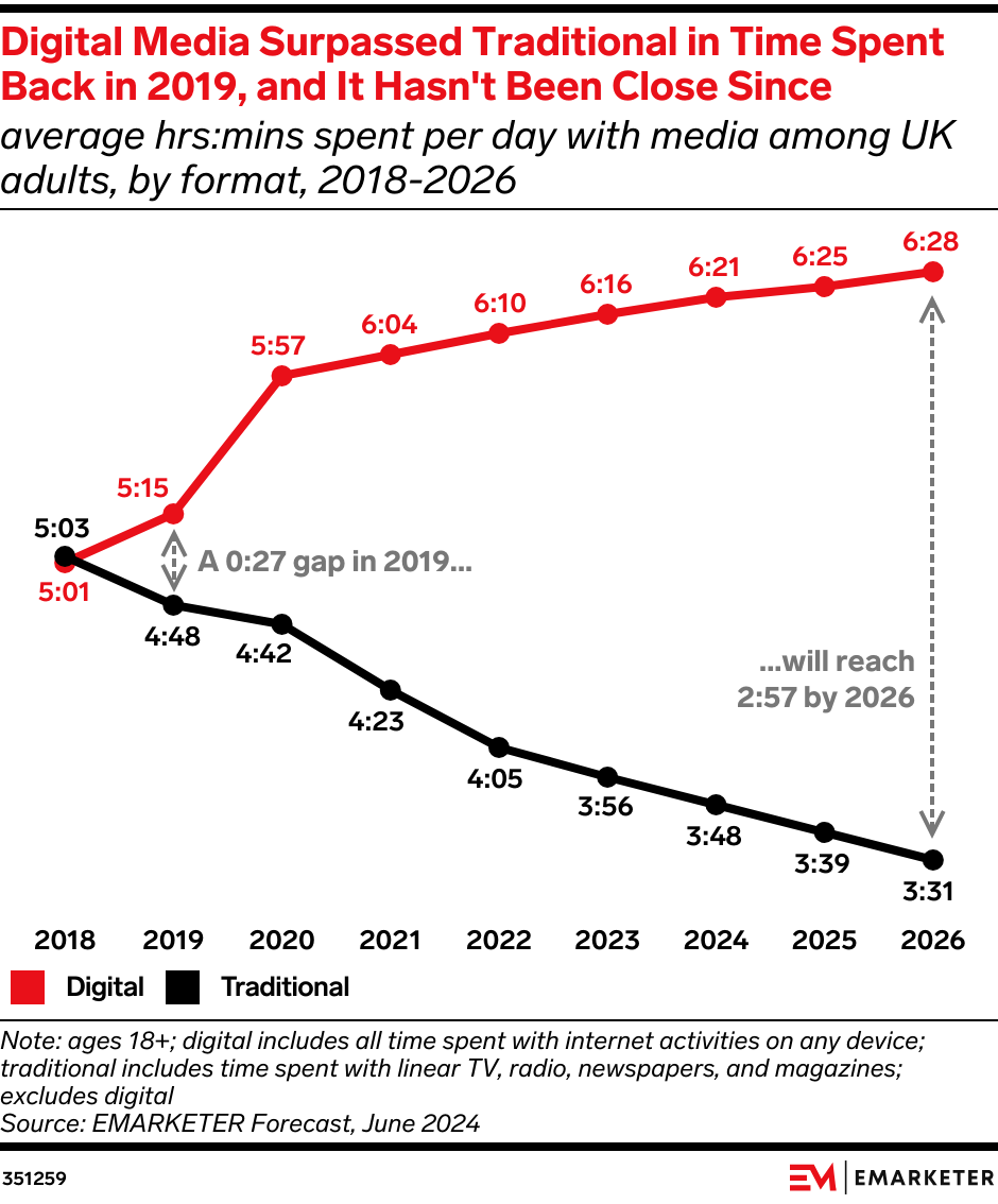 Key Stat: Just before the pandemic hit, digital accounted for 27 minutes more media time than traditional. But the gap has grown significantly, and digital will be almost 3 hours ahead by 2026.