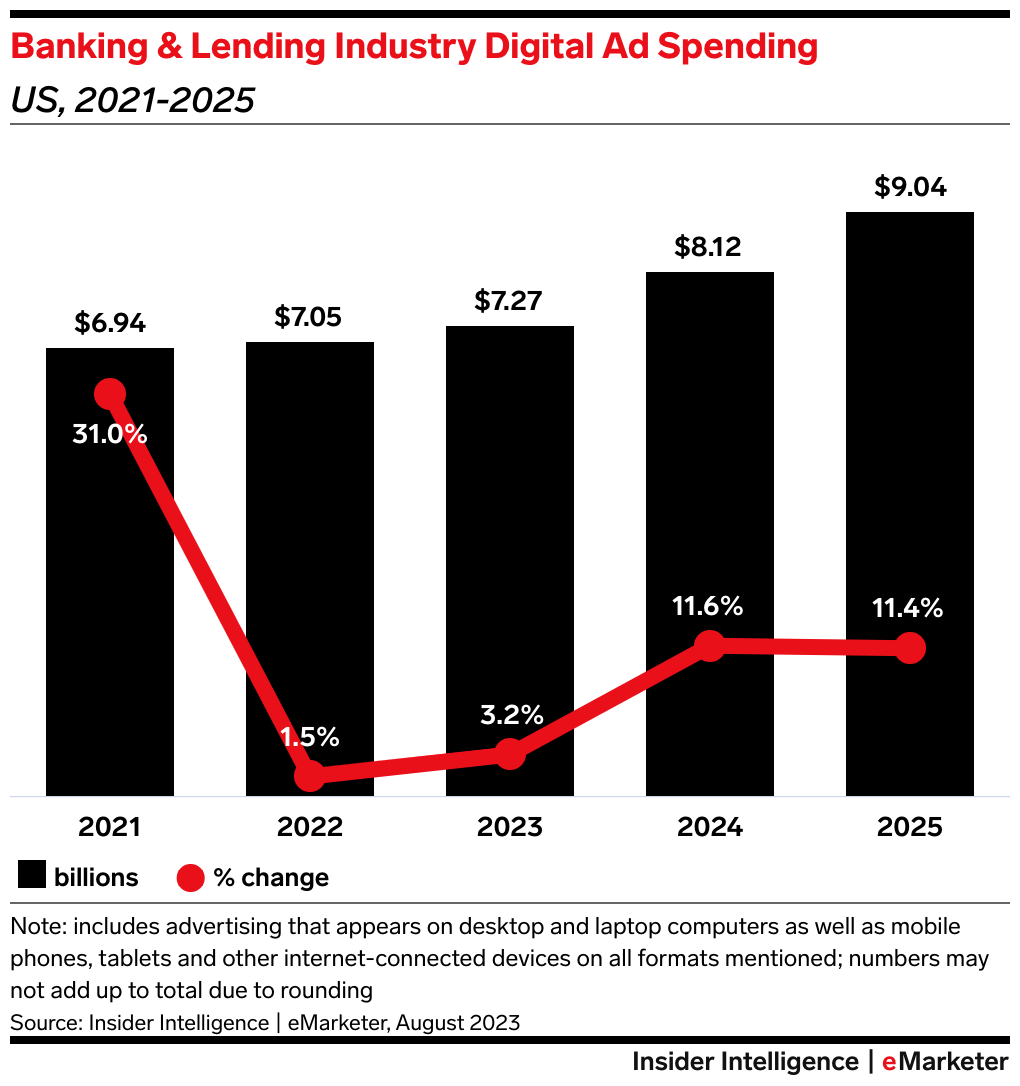 KEY STAT: US banking and lending digital ad spending is facing another year of low-single-digit growth amid industry and economic uncertainty. But we expect a 2024 rebound as the environment improves and regional banks contribute more to the pie after a tough 2023.