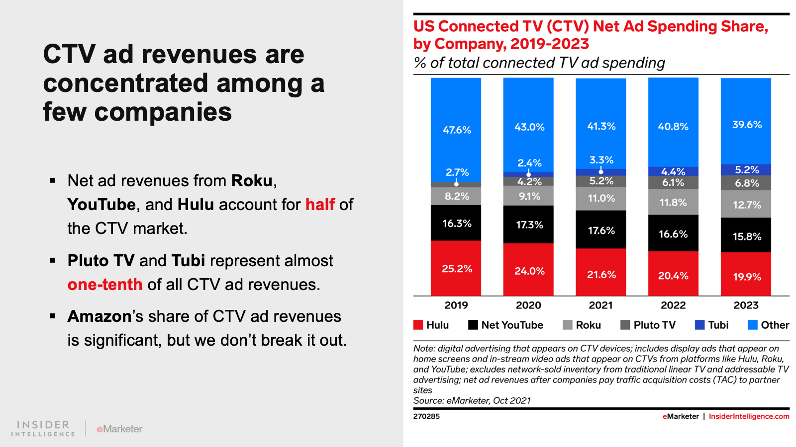 Net ad revenues from Roku, YouTube, and Hulu will account for half of all US CTV ad revenues this year.