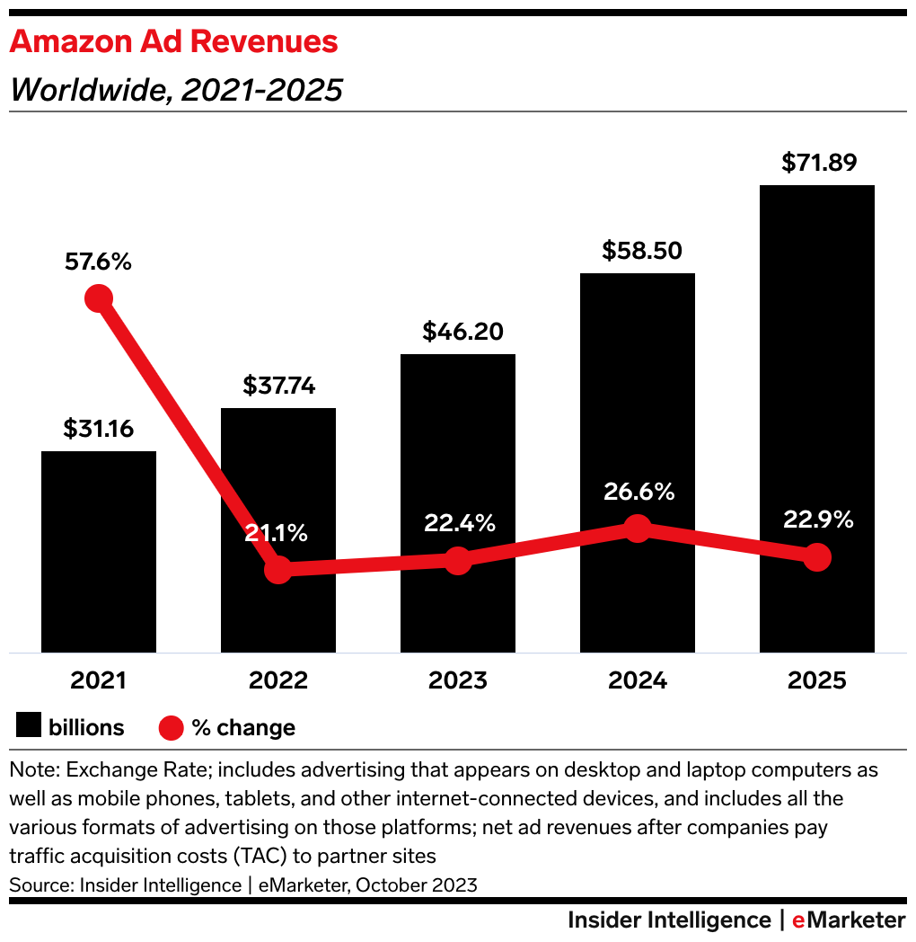 - Amazon's advertising business has seen robust growth—revenues topped $12 billion in Q3, a 26% increase from the previous year. This growth in advertising revenues—Amazon now accounts for 7.5% of the global digital ad market—comes as the retailer capitalizes on changes, like the effects of Apple's 2021 iOS privacy update.
