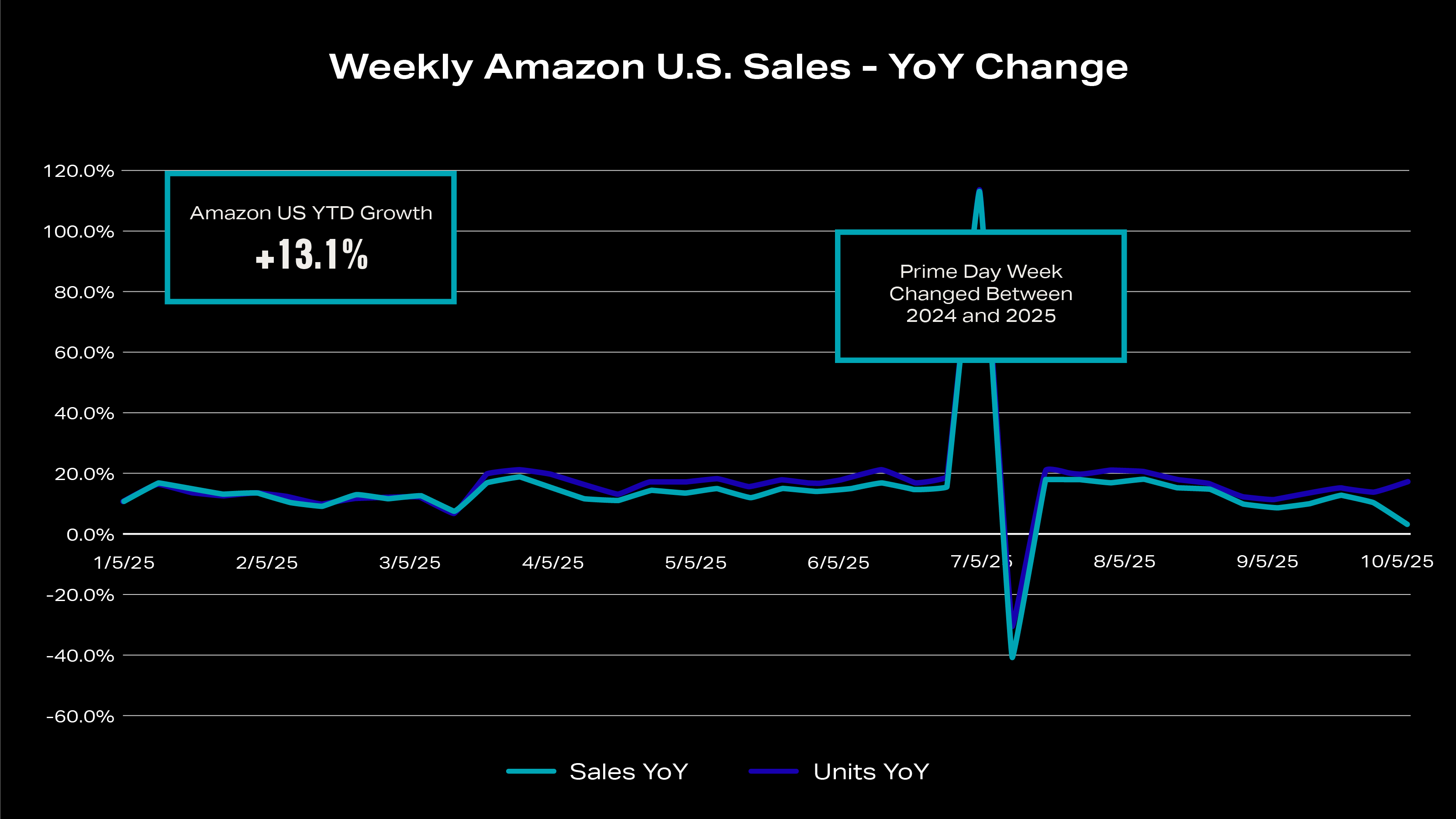 Prime Big Deal Days sales increased 3% year-over-year, compared to 13% growth last year. However, unit sales rose 17%, indicating consumers are still buying but choosing lower-priced items. The average selling price of the 1,000 best-selling items on Amazon US during Prime Big Deal Days fell 4.7%, the largest drop since early 2024, while the average discount rate decreased from 28% to 24%.