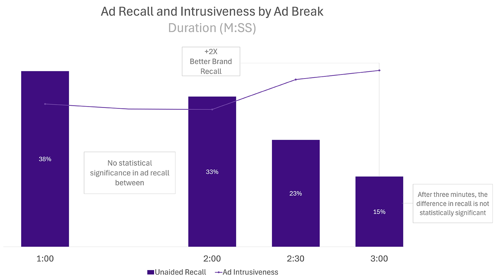 Furthermore, while a one-minute ad break had slightly higher brand recall (38%) and lower ad intrusiveness, the differences were not statistically significant. Overall, this indicated that two minutes or less is best when it comes to the length of a single break.