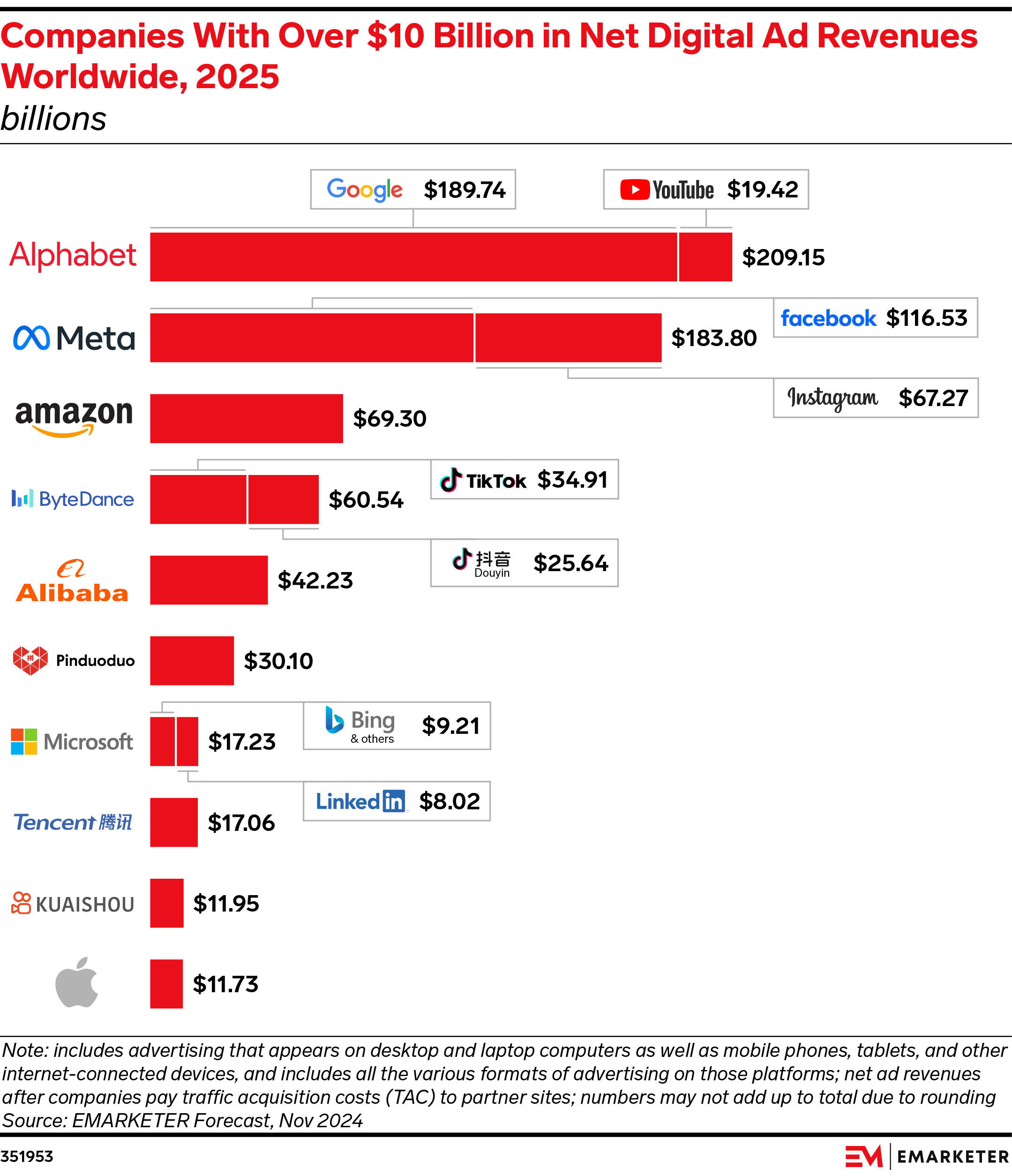 Key Stat: Google and YouTube will generate over $200 billion in worldwide digital ad revenues for Alphabet in 2025, the first time any advertising company has reached that threshold. However, Google’s ad revenue growth (9.2%) will be toward the bottom of the pack.