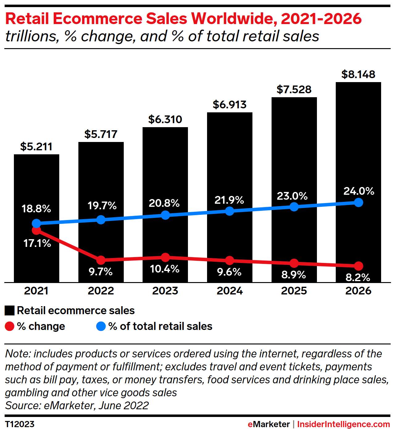 We began tracking ecommerce on a global scale in 2010, and until last year, worldwide ecommerce sales growth had always exceeded 20% per annum. In 2021, growth dropped to a still-healthy 17.1%. In 2022, however, deceleration will be severe. We estimate just 9.7% growth this year.