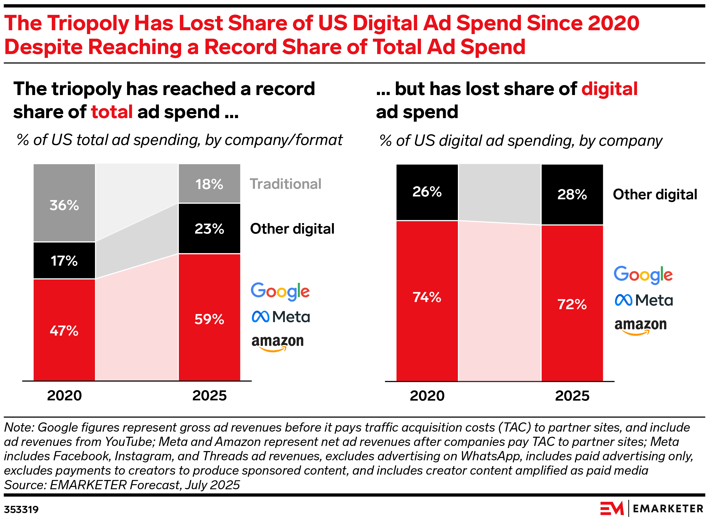 The triopoly looks stronger, but it's digital that's getting bigger. Amazon, Google, and Meta now command 58.8% of total US ad dollars, up from 47.1% in 2020. But that's not an indication that the triopoly's control of the digital ad market is growing.