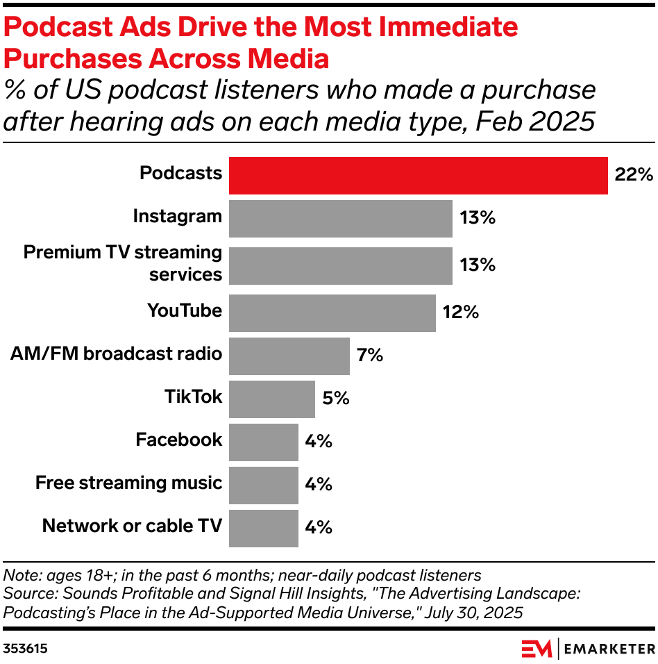 The news: Podcast ads are the most effective way to drive action through advertising across media types, per a new study from Sounds Profitable and Signal Hill Insights. 22% of monthly podcast listeners have made an immediate purchase after hearing an ad on a podcast in the past six months, per the study. Podcasts outperformed users of premium TV streaming services like Peacock and Netflix (13%), Instagram (13%), YouTube (12%), and TikTok (5%). Our take: As audiences shift to digital, podcasts demand advertiser investment. Brands that pay attention to the format and take steps to innovate will succeed long-term.